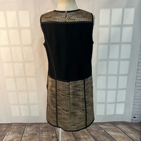 This dress is a stylish and elegant piece. The tweed fabric with the contrasting black and gold threads adds a touch of texture and sophistication. The sheath silhouette is flattering and the sleeveless design makes it suitable for warmer weather. Brand: Maggy London Department: Women's Size: 10 Color: Black and Gold Style: Sleeveless Sheath Dress Closure: Zipper Neckline: Round Neck Sleeve Type: Sleeveless Sleeve Length: Sleeveless Pattern: Tweed with Black and Gold Threads Material: 100% Polyester Condition: Pre-Owned Features: - Sleeveless design with a classic sheath silhouette - Round neckline - Contrasting black and gold tweed fabric - Concealed back zipper closure - Fitted design with a streamlined look Approximate Measurements (Lay Flat): Pit to Pit: 19.5" Waist: 18.5" Hips: 20.5" Length: 35"