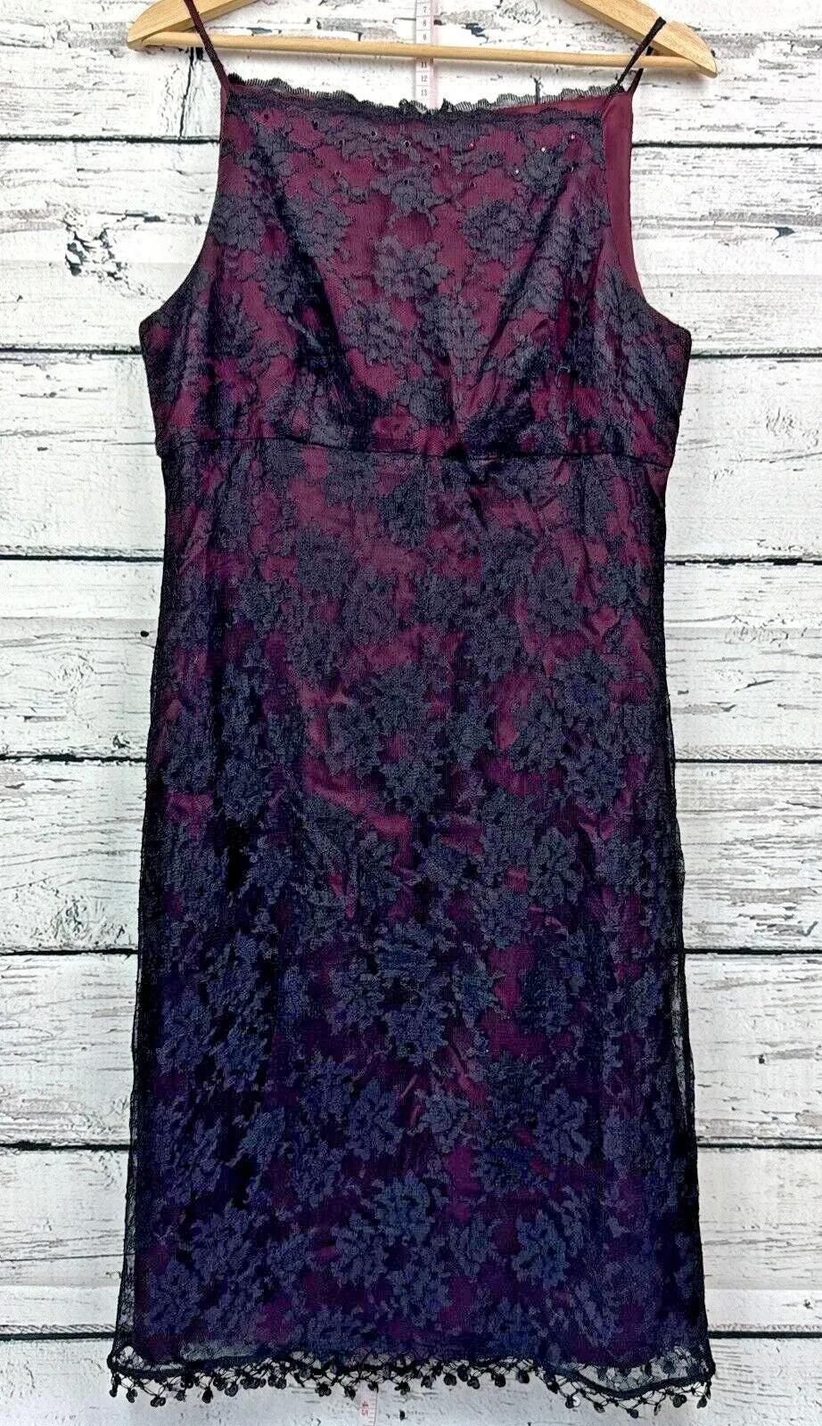 Elegant cocktail dress featuring a delicate black lace overlay on a rich purple lining. This sleevel... Show more
