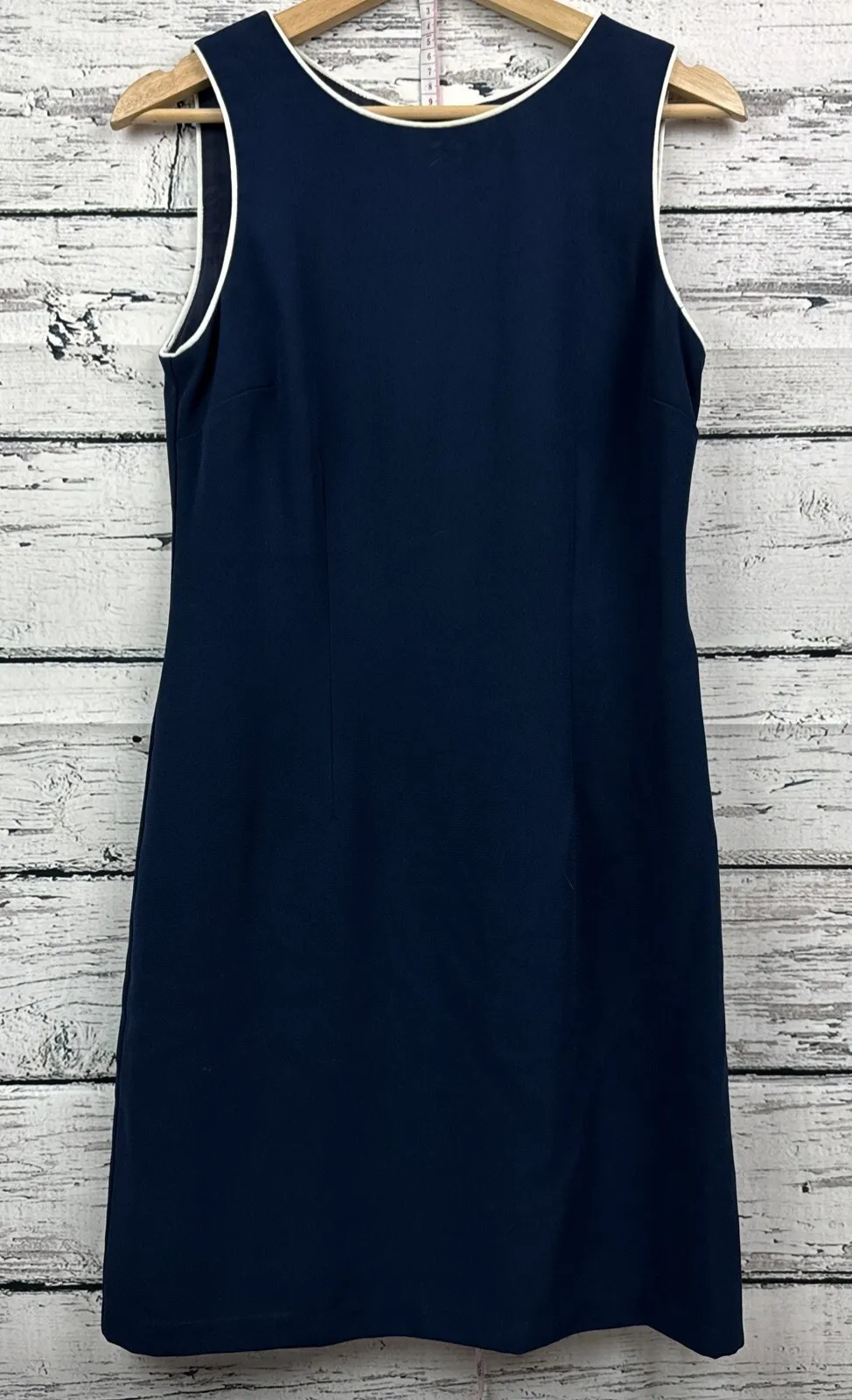 Elegant sheath dress in a solid navy blue, designed with a flattering sleeveless cut and a classic silhouette. Crisp white trim accents the neckline and arm openings, adding a touch of sophisticated contrast to the clean design. The dress is fully lined. Keywords: navy blue dress, sleeveless dress, sheath dress, white trim, classic dress, retro dress, contemporary dress, Caren Desiree Company, CDC dress, lined dress, size 8 dress, polyester dress