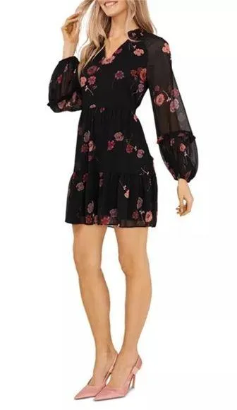 CeCe Floral Babydoll Dress in Rich Black, Size XL New with Tag, Retail $99 Elegant black dress with floral patterns, perfect for any occasion. Features a comfortable fit and stylish design. Features: V-neck with ruffled collar Long blouson sleeves Tiered skirt Lined Pullover style Imported Fits true to size, order your normal size Fit-and-flare silhouette Non-stretch fabric 100% polyester Machine wash Designed to hit above the knee Model measurements: 5'10" height, 33.5" bust, 23.5" waist, 34.5" hips, wearing a size small Approximate measurements laid flat - shoulder to hem 37” - underarm to underarm 23” 006