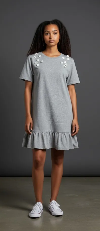 Add a touch of feminine charm to your wardrobe with this CeCe gray short sleeve t-shirt dress. Featuring delicate floral appliqué details and a playful ruffle hem, this dress combines casual comfort with elegant style. Perfect for daytime outings, brunch, or weekend wear. Details: CeCe t-shirt dress, crewneck, ruffle around the bottom, knee length, short sleeve, floral appliqué w/silver studs, pull on style, soft stretch fabric, cotton, spandex, hand wash. Condition: Pre-loved, in excellent condition. No visible flaws or defects Size: Medium (pit to pit 19.5" length 34" sleeve 10") not exact Style Aesthetic: Feminine, Casual Chic, Effortless, Modern, Athleisure 11.3.25