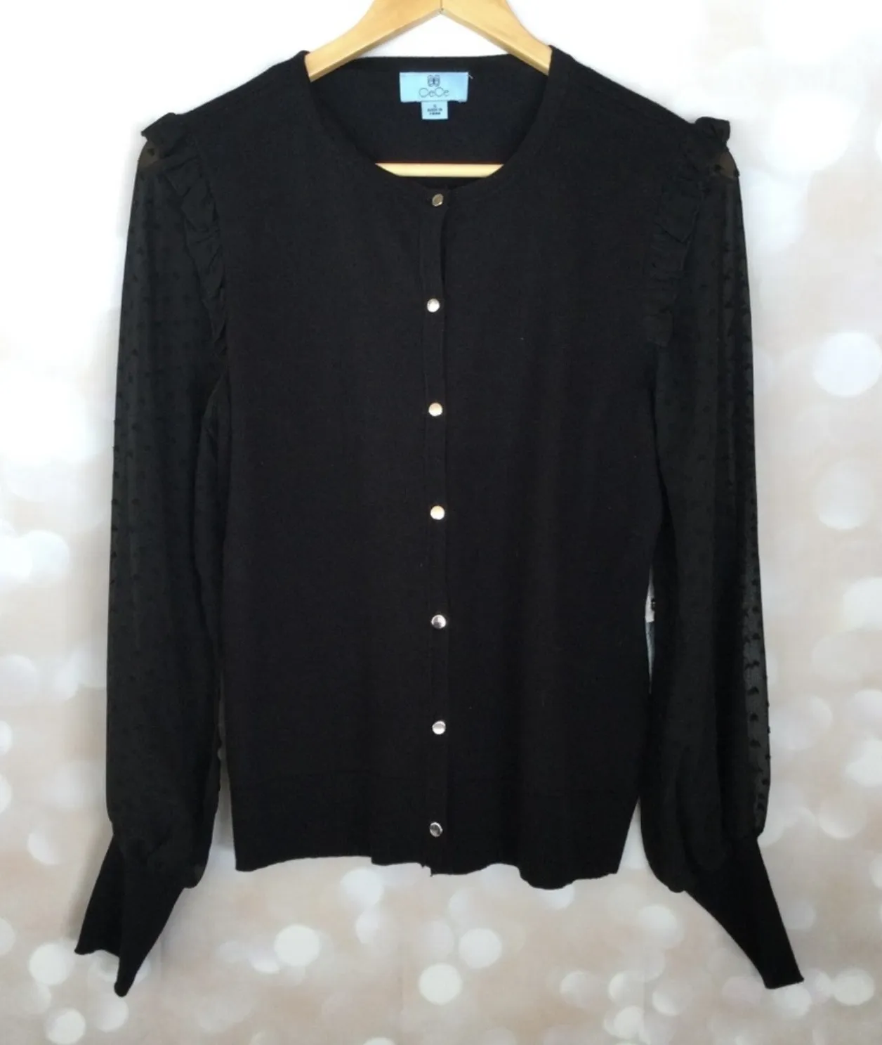 CeCe Scarlet Dream Black Cardigan New with tags. Retails $99 Size Small Marking through description tag Sleeves are see through with heart designs Hand wash Stretchy Silver hardware Bust 18” Flat front length 19” Sleeve length 24.5” “A”