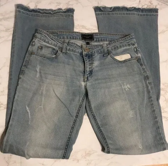 Size 7/28 Distressed lo rise flare jeans Some wear near zipper Light wash