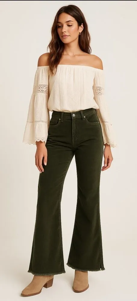 On-trend Celebrity Pink olive Night corduroy wide leg pants with relaxed Baggy Fit, raw frayed hem,... Show more