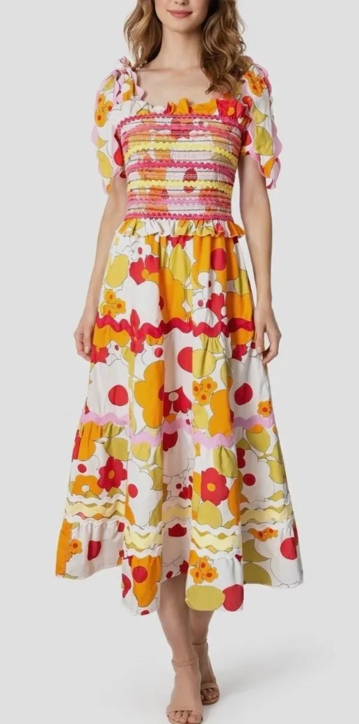 CeliaB Colorful Floral Sunstone Smocked Midi Dress. Excellent used condition with no flaws. Size Large. Chest - 16" Waist - 15" Length - 51" Celia B midi dress showcasing a vibrant floral print with a playful shirred bodice. This dress features a square neckline, short puff sleeves with scalloped trim, and tie shoulder details for a customizable fit. The smocked bodice is adorned with colorful horizontal stripes and delicate ruffles, leading to a flowing A-line skirt with tiered sections and ruffled hems. A back zipper closure ensures a secure fit. Perfect for a summer garden party, a vacation getaway, or a chic daytime event. Material: 97% Cotton, 3% Spandex Closure: Zip Midi dress, floral print, smocked bodice, tie shoulder, scalloped trim, ruffled, summer dress, vacation wear, garden party, bohemian, feminine, colorful, statement dress, resort wear SKU 3325