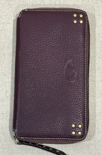 Grainy leather wallet is in great condition. Color is burgundy with goldtone studs. Zipper runs smoo... Show more