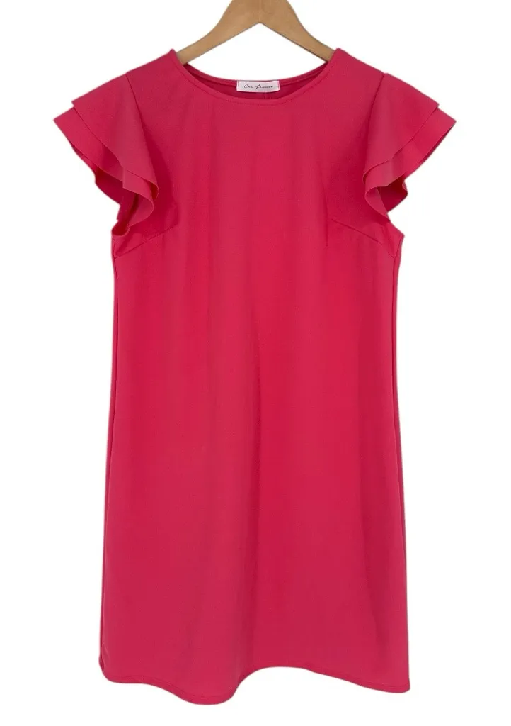 Cute little throw on and go dress, featuring a solid coral fabric with stretch, higher rounded neckline, flutter cap-sleeves. Unlined. No flaws, new with tags. Color is a bit more on the orange side of coral, photographs more on the pink side.