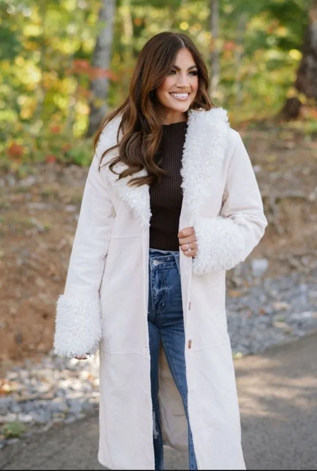 Beautiful jacket with sherpa collar and sleeve cuffs. More of a creamy color than shown in photos. B... Show more