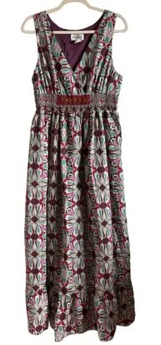 B2 L/XL Embrace effortless bohemian charm with this stunning maxi dress. The vibrant floral print in rich jewel tones and earthy neutrals dances across the fabric, creating a captivating visual symphony. A flattering V-neckline flows into a beautifully smocked empire waist, accentuated by subtle decorative details, offering a comfortable and adjustable fit that gracefully cinches your silhouette. The sleeveless design keeps you cool and chic, while the flowing maxi length adds a touch of sophisticated elegance. Perfect for a leisurely brunch, a garden party, or a relaxed evening out, this dress transitions seamlessly from day to night. Style: Maxi, Sundress, A-Line, Fit & Flare Dress Length: Long Department: Women Sleeve Length: Sleeveless Pattern: Floral Occasion: Casual, Party/Cocktail, Travel Material: 100% Cotton, Cotton Fabric Type: Woven Neckline: V-Neck Season: Summer, Spring Closure: Pullover Keywords: Chadwicks dress, maxi dress, floral print dress, sleeveless dress, V neck dress, smocked waist dress, bohemian dress, summer dress, women's dress, size 14 dress, cotton dress, long dress, casual dress, party dress