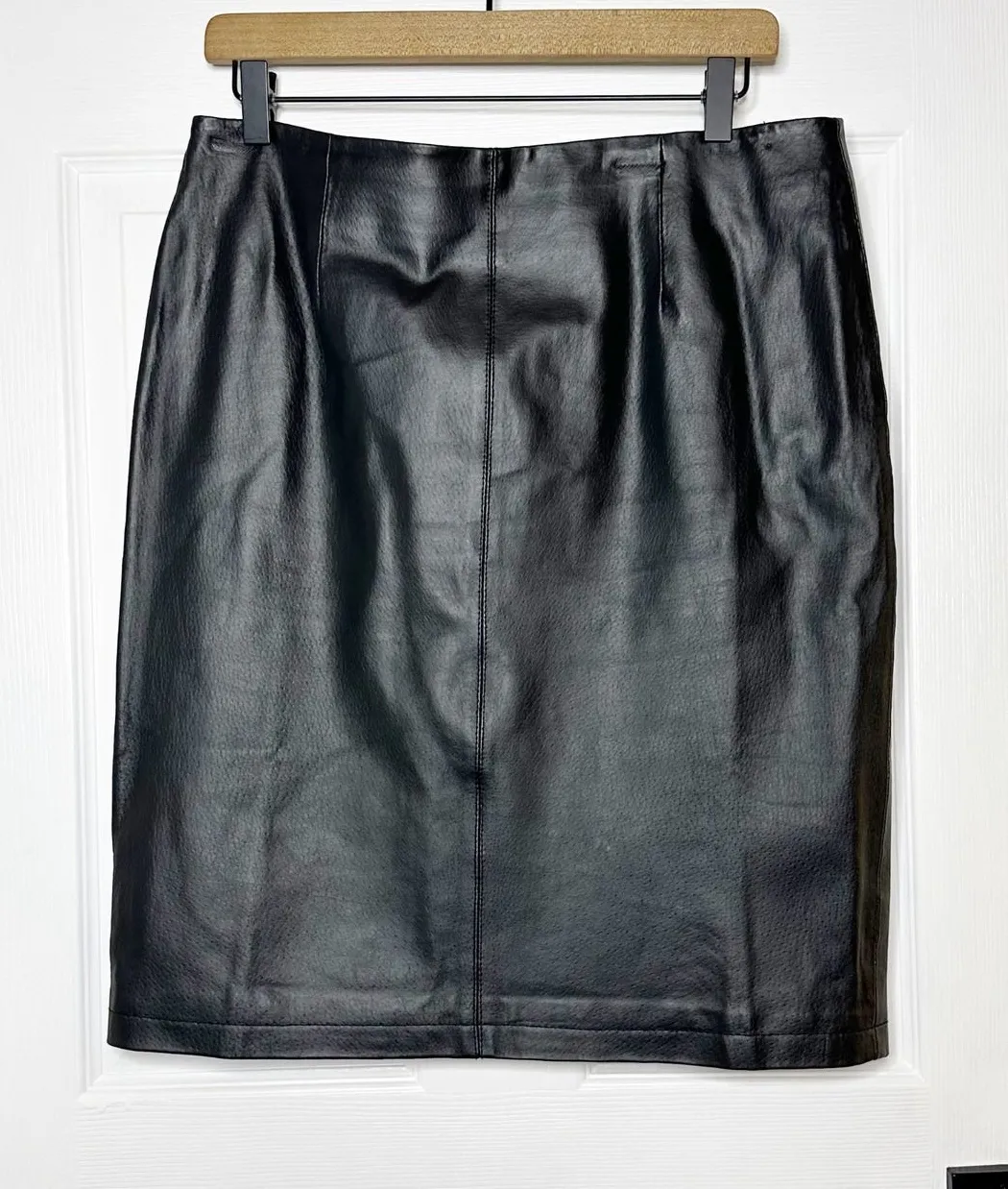 Elevated style comes effortlessly with this sleek leather skirt. This classic pencil skirt boasts a flattering silhouette and a sophisticated touch, making it a versatile addition to any wardrobe. The skirt features a streamlined design that ensures a comfortable fit. Ideal for office settings, business meetings, or an evening out, this skirt will make you feel confident and polished. *Excellent condition *Size 6, approx: -16" waist -22" length (K11) Keywords: leather skirt, pencil skirt, black skirt, career skirt, classic skirt, business skirt, womens skirt, Chadwicks of Boston, retro, 90s, vintage style, workwear, office attire, professional skirt
