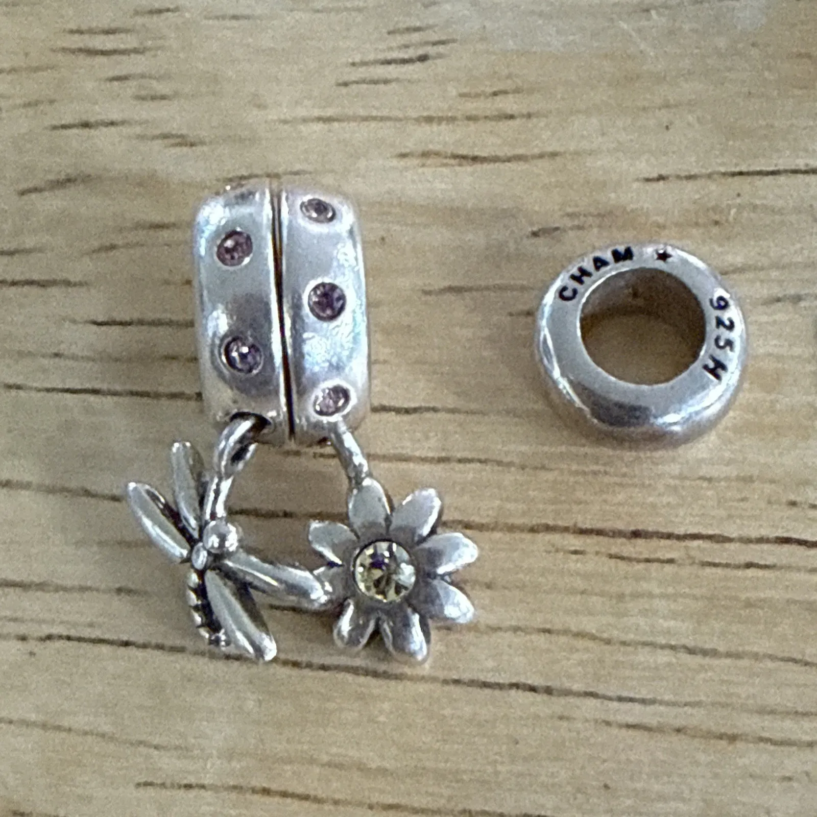 Please review pictures for overall condition and approx size This is a Chamilia 925 sterling silver "You and Me" flower and dragonfly dangle charm with a yellow Swarovski crystal center. Included with a 925 Chamilia spacer