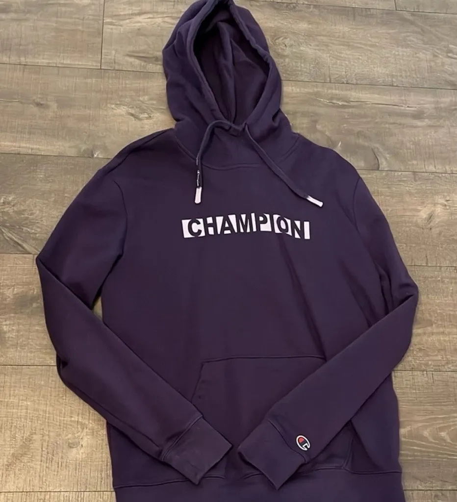 Classic Champion hoodie in dark purple. Features logo on chest. Ideal for everyday wear.