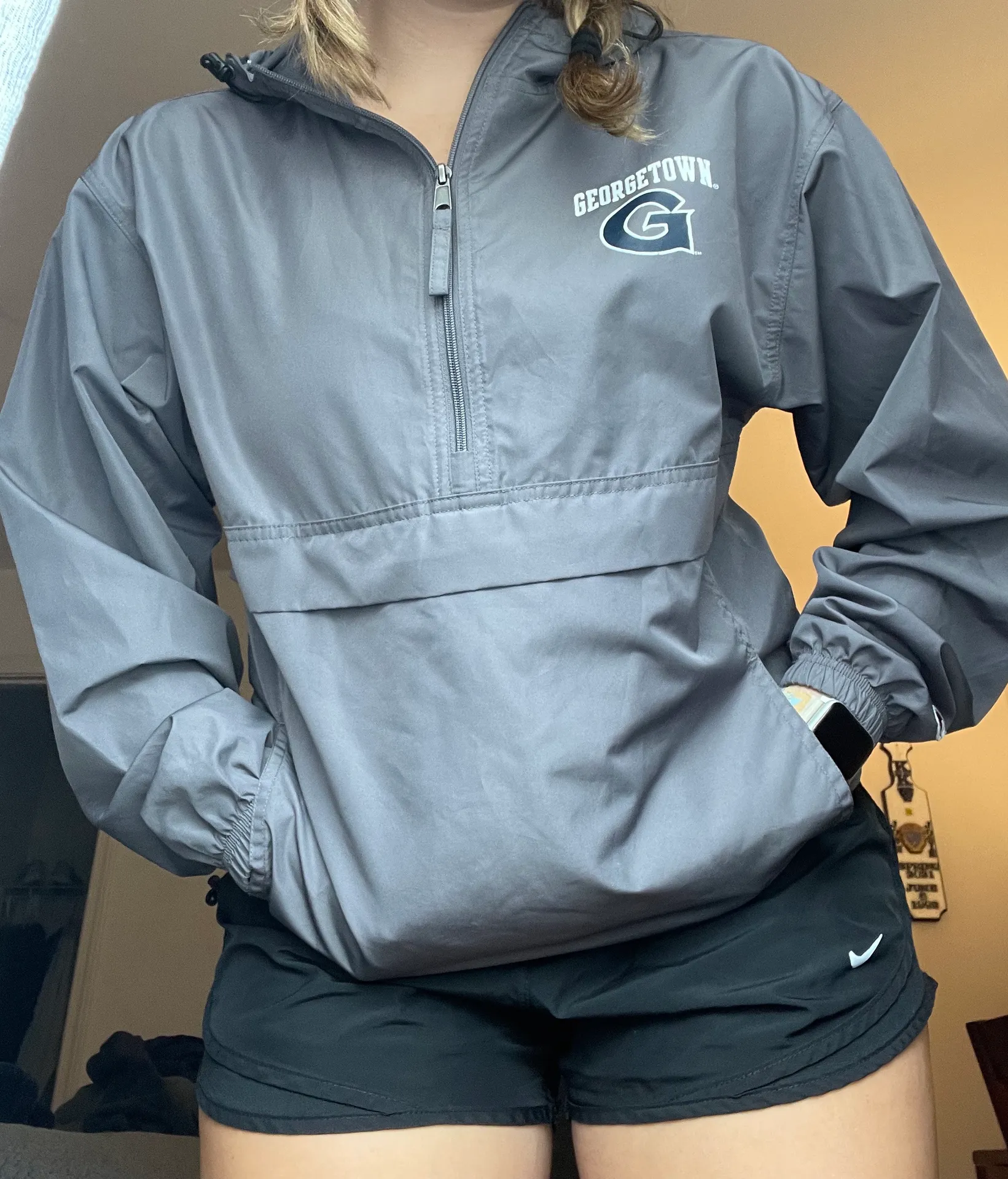 champion georgetown university windbreaker, size small. barely worn, like new. has a hood and quarte... Show more