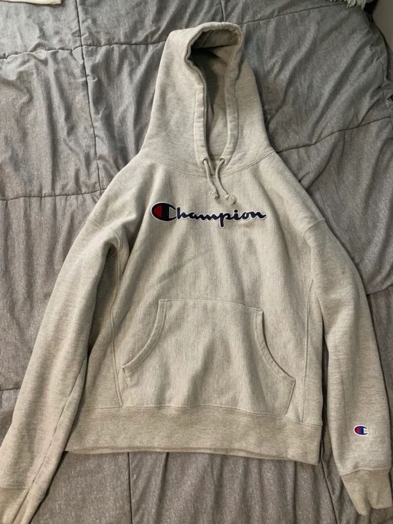 Light gray hoodie with small hole by pocket. Runs a little small. Barley worn.