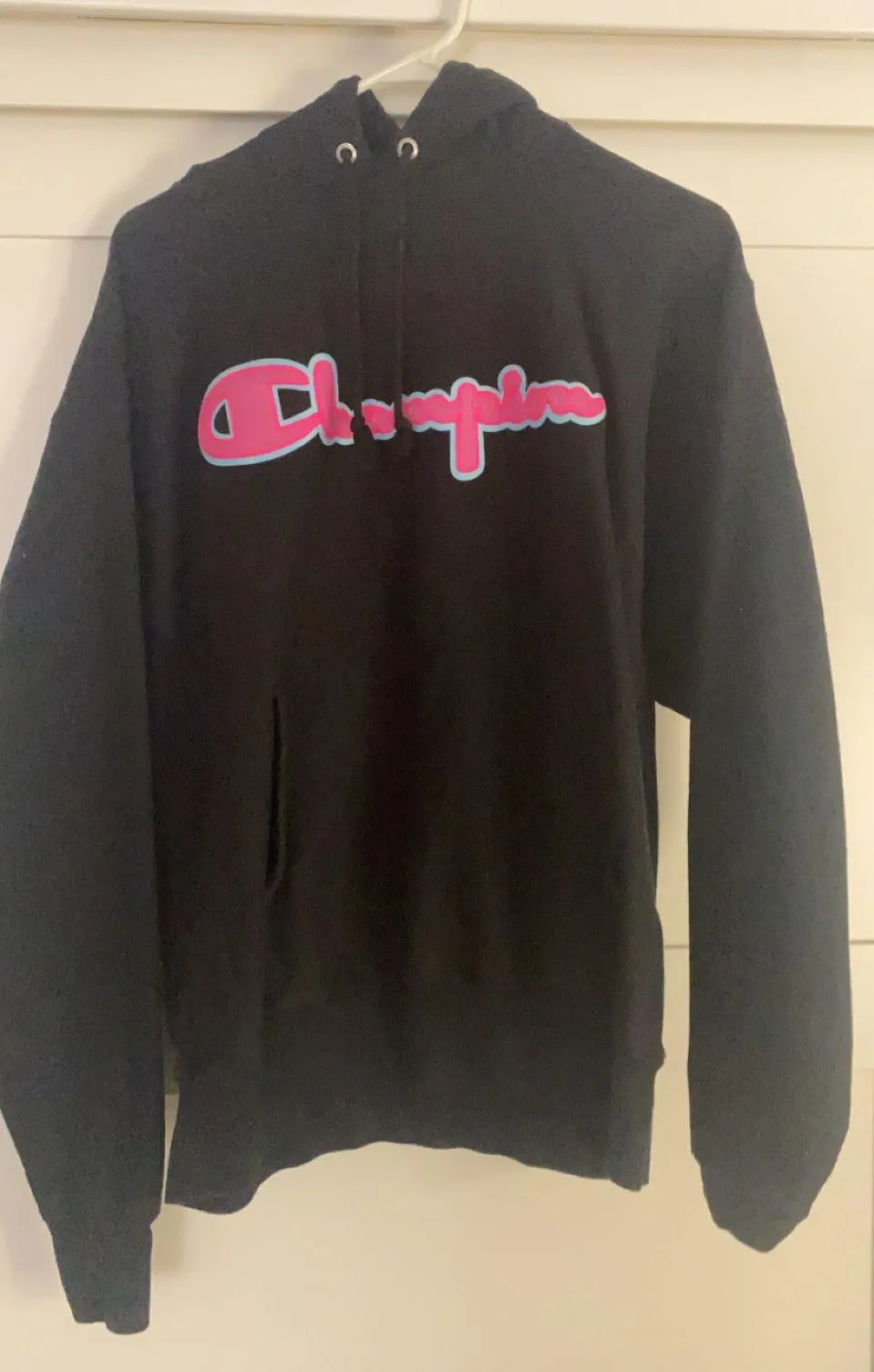 Black champion hoodie Pink and blue writing only worn once nothing wrong i just don’t wear it