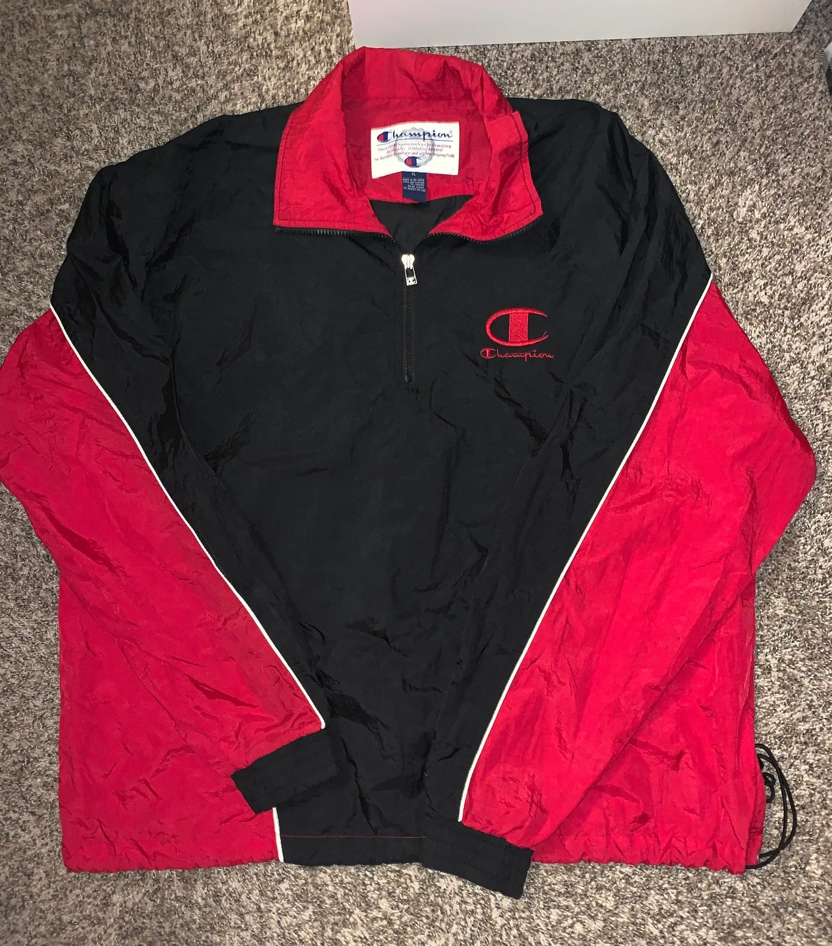 Red and black champion windbreaker, this is older, a little vintage even. It’s in great condition, I... Show more