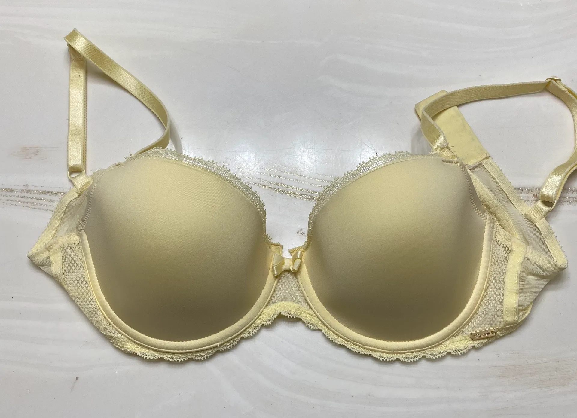 Very cute yellow bra! It is a size 32D, with the daintiest color and lace details :) Chantelle has very well made-sturdy bras! This has been worn once or twice, is still very much like new! A great addition to anyone’s closet :)