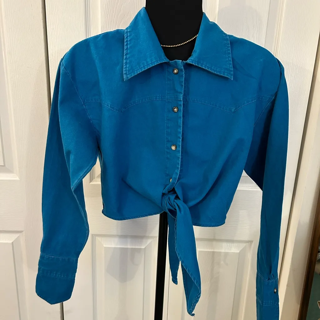 Excellent Vintage Condition No holes rips tares Top is a light weight but structured Jean like material! Faded Turquoise V pointed sleeves that are pleated with an extended look M Pit 19.5, sleeves 24, length 19