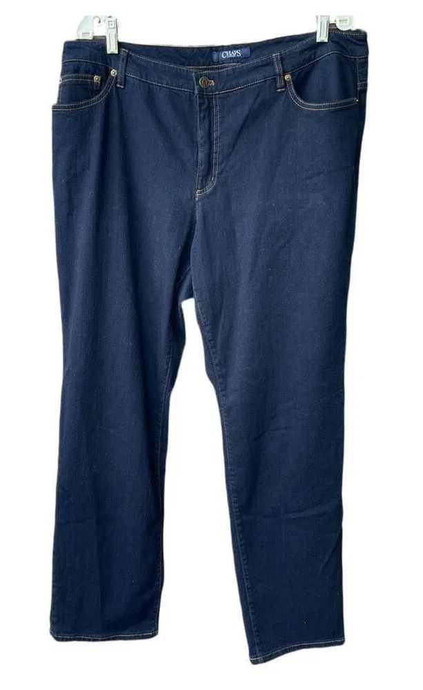 Chaps dark wash size 14 straight legs Daniella Curvy jeans. Button zipper fly with slimming panel i... Show more