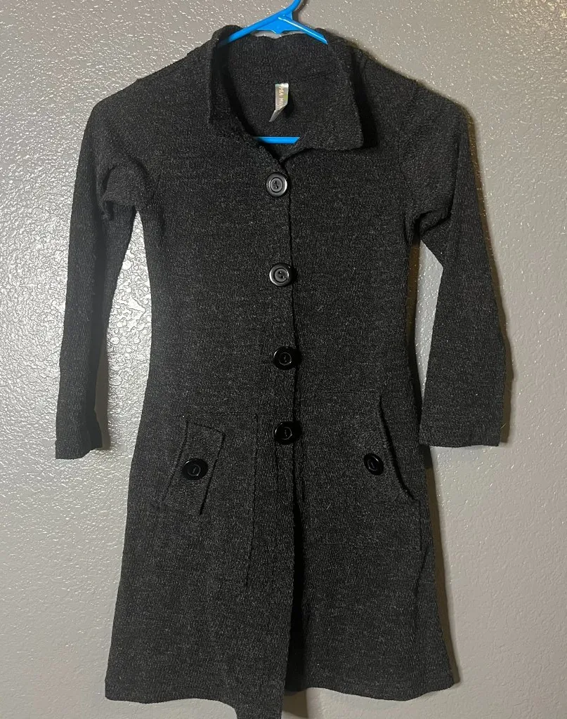 This unique charcoal grey knit piece functions as both a long cardigan and a dress, featuring a button-down front and a flattering silhouette. The soft knit fabric and versatile style make it a cozy and chic option for layering or wearing on its own. Fashion Style: Casual, Bohemian, Indie Measurements: Pit to Pit: 11.5 inches (likely measured flat and unstretched due to knit) Length: 29 inches