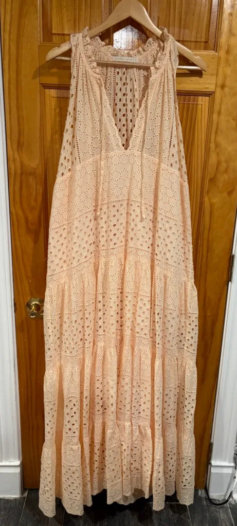 Beautiful Charina Sarte sleeveless maxi dress in a light peach / blush tone. Features allover embroidered eyelet lace, a deep V neckline, and a flowy tiered silhouette. Unlined at the shoulders with a cotton lining through the body for modesty. Pull-on style with a relaxed, bohemian resort feel — perfect for vacation, summer events, or beach getaways. Details: Brand: Charina Sarte Size: Large Fabric: 100% Cotton Color: Peach / Blush Designed in Paris, Made in the Philippines Length: Maxi Style: Eyelet tiered sundress Condition: Excellent preowned; no visible flaws. Please note measurements are approximate and may vary slightly. Color may appear different in photos due to lighting and monitor settings.