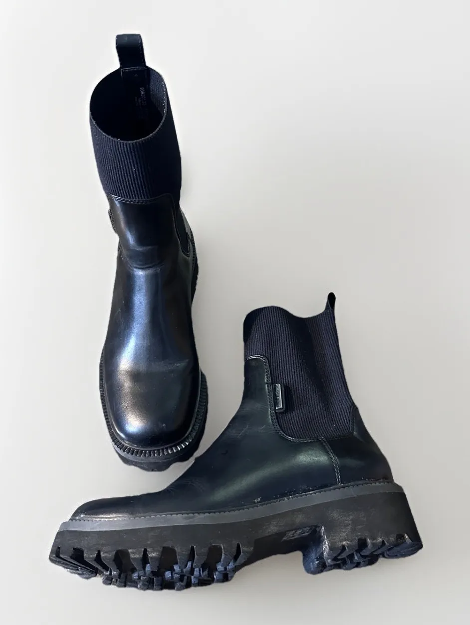 When in doubt, you can always count on a pair of black boots to complete any fall-winter outfit. While they may look like your regular Chelsea boots at first glance, this pair comes with smooth uppers and knitted sock shafts for a unique textural contrast. The elasticated and soft knitted socks make them easy to wear, while offering comfort and warmth from the cold. Item No: CK1-90920133_BLACK Material:Natural PU Material lining:Fabric Sole material:PU Shoe weight (1 pair):724 g Shoe width:3.7 in Heel height:1.7 in Shaft height:6.7 in Shaft circumference:9.3 in Ankle circumference:10.2 in In good condition has a small scuff on the back and one on the front . Last pictures indicate this .