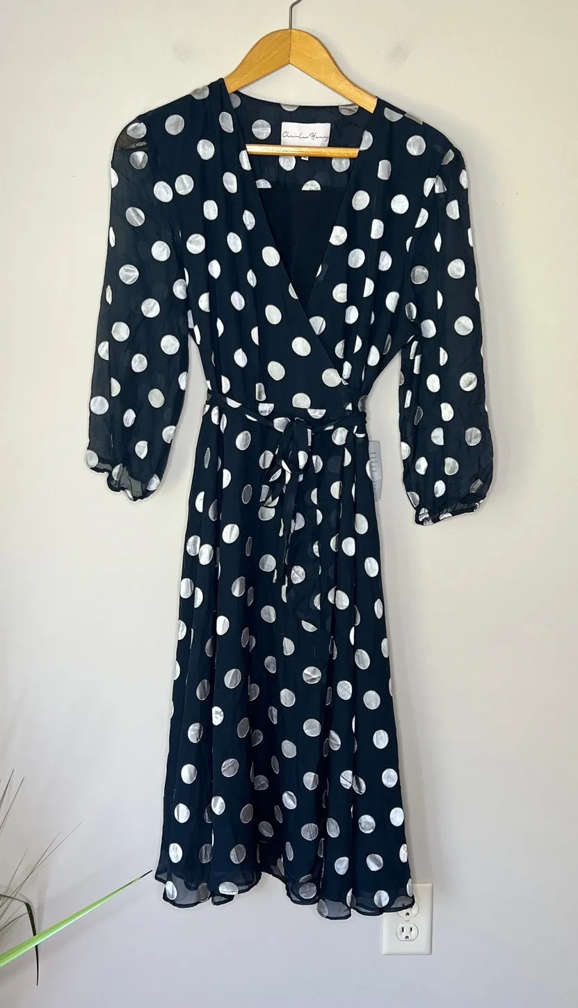 Charles Henry Navy w/ Silver Polka Dots Wrap Dress Size Large NEW WITH TAGS Sheer Long Sleeves... Show more