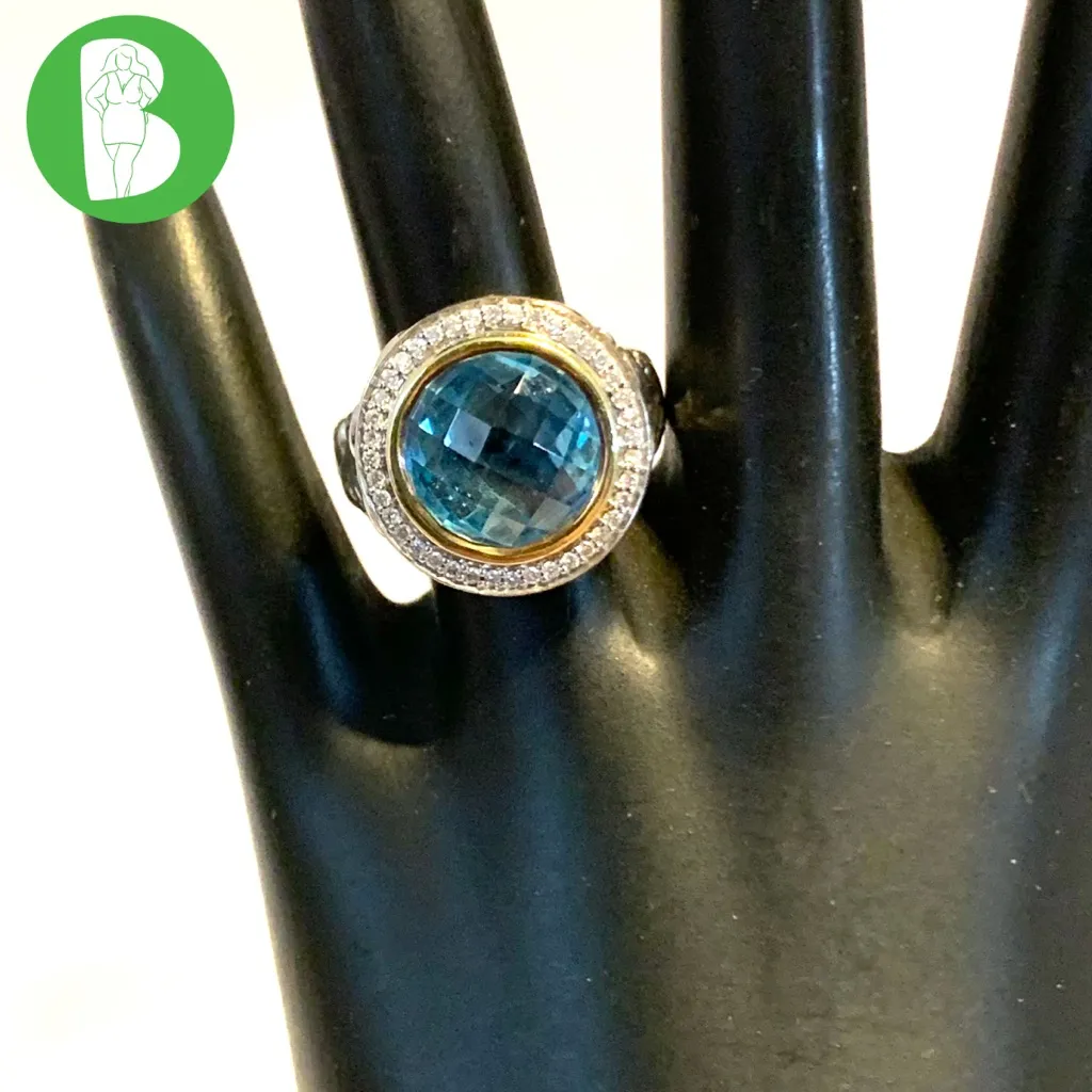 This listing is for the ring pictured Ring Size 5.75 Materials Sterling Silver and 18K yellow gold Primary Stone(s) Type: 9MM faceted Blue Topaz Primary Stone(s) Type: 32 Diamonds weighing .16 carats total Hallmarks are partially rubbed off from wear. Total Weight (grams) 10.80 Ring is a size 5.75; ring will likey feel smaller on the finger due to thick construction; likely not resizable unless buyer knows a jeweler who will resize sterling silver additional measurements are provided in photos. Enlarged photos are utilized to show detail in jewelry listings. It is important for potential buyers to use photos with measuring tape to determine actual physical size of the piece. * Pre-owned jewelry and watches may have minor markings/imperfections throughout and may have been modified from their original retail condition. * While we represent items accurately on our site to the best of our ability, the color calibration of computer monitors can vary, causing colors to appear slightly different from one monitor to another. Due to this, please note that precise color representation of metal and gemstones is not always possible.