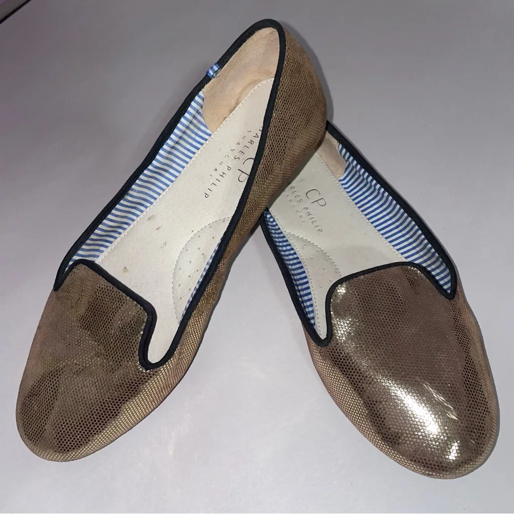 Excellent pre-owned condition Comment questions, I'm happy to help. Check out my closet! Bundle & save Elevate your style with these elegant women's gold loafers. Perfect for any occasion, they combine comfort with a touch of luxury. Holiday glam