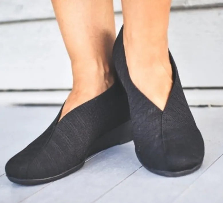 First picture is example however, these shoes have strands of silver in them. They are not solid black. Size 6 Supportive low wedge 1 inch heel. V-cut design Stretch upper, slip-on, rubber bottom Bunion friendly Elastic upper padded insole Fit: Half size down Machine washable Made in Mexic Keywords: Charleston Shoe Company, Black wedges, V cut shoes, Knit wedges, Comfortable heels, Slip on shoes, Low wedge, Casual wedges, Contemporary shoes, Stylish wedges, Everyday shoes, Black knit, Shoes