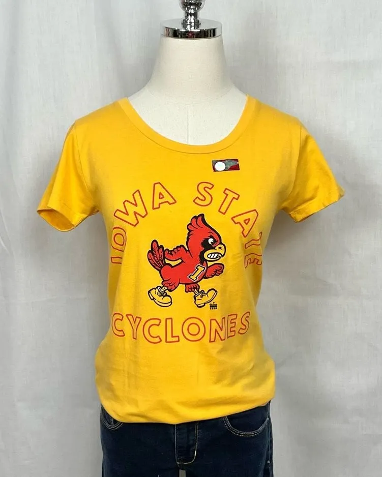 Charlie Hustle Yellow Iowa State Cyclones Ladies Fitted T-Shirt Tee Ladies yellow fitted short sleeve t-shirt Crewneck Featuring a multi-color Iowa State Cyclones graphic with Cy the Cardinal Size Small Approximate measurements Width under arms: 16" Length: 24" New without tags Charlie Hustle * Ames * Iowa State * ISU * Made in USA * Brock Purdy * T Shirt * Cyclones * Retro * Slim Fit * Football * Tee Shirt * Cy the Cardinal