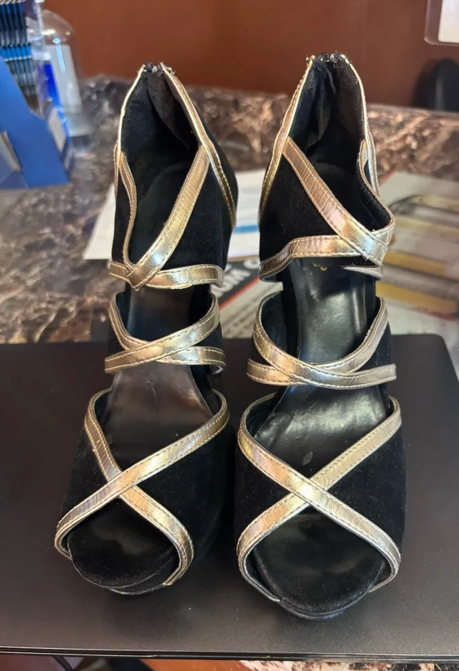 Step out in style with these elegant black and gold women's heels. Perfect for any occasion, these s... Show more