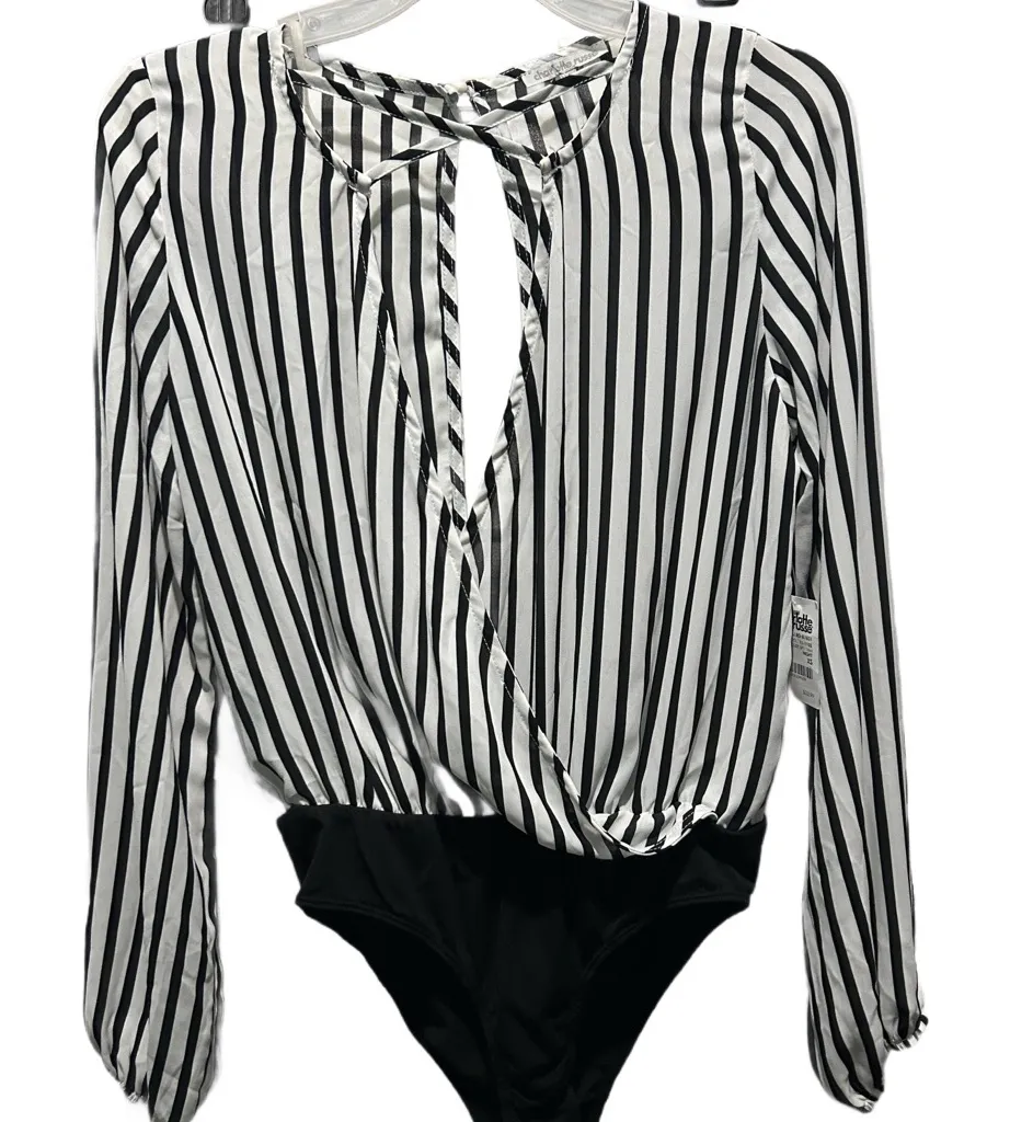 Elegant top with bold black and white stripes. Perfect for a chic look. Black and white striped body... Show more