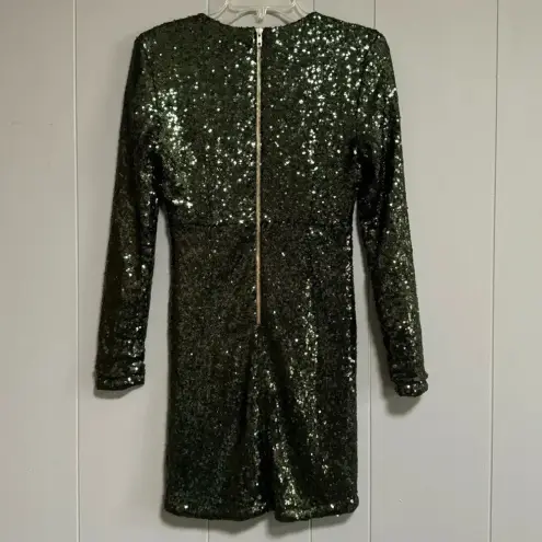 -Dark Green Allover Sequins -Size Small -Ruching at ends of sleeves -Pleated waist -Deep V neckline... Show more