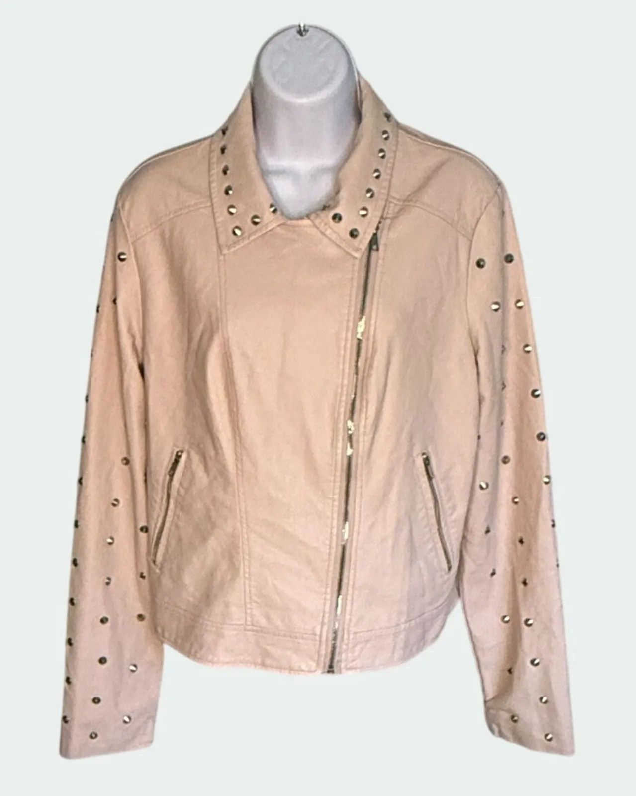 This stylish jacket combines a soft blush pink tone with edgy silver studded details. Designed with... Show more