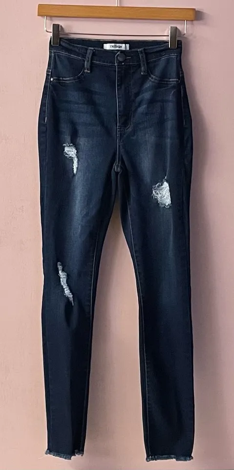 Classic dark wash high waisted skinny jeans with light distressing on the front and raw hems. In exc... Show more