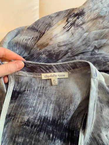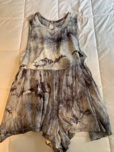 Super cute flowy romper. White grey and blue “tie dyed” colors. Worn once. Open back and clip at top... Show more
