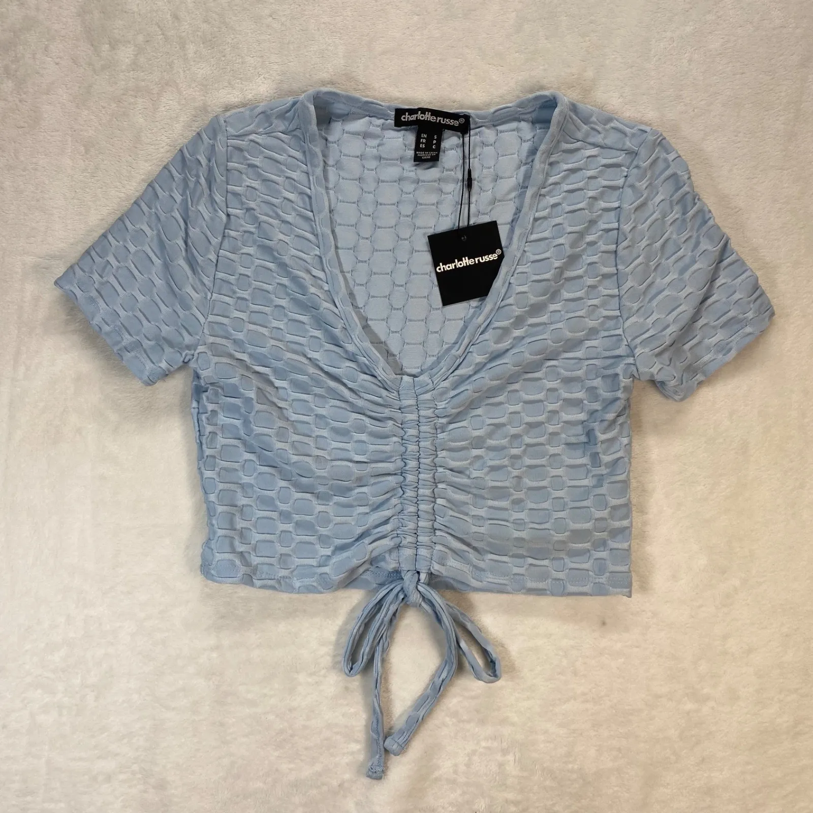 Keywords: crop top, ruched top, plunge neck, textured top, blue top, short sleeve top, summer top, casual top, party top, going out top, small top, charlotte russe, tie front top, y2k, trendy, deadstock, bella swan, twilight, y2k, fairycore, cyber goth, 2000s, layer, whimsygoth, elena gilbert, coquette, dollette, cottagecore, fairy grunge, dead stock, deadstock