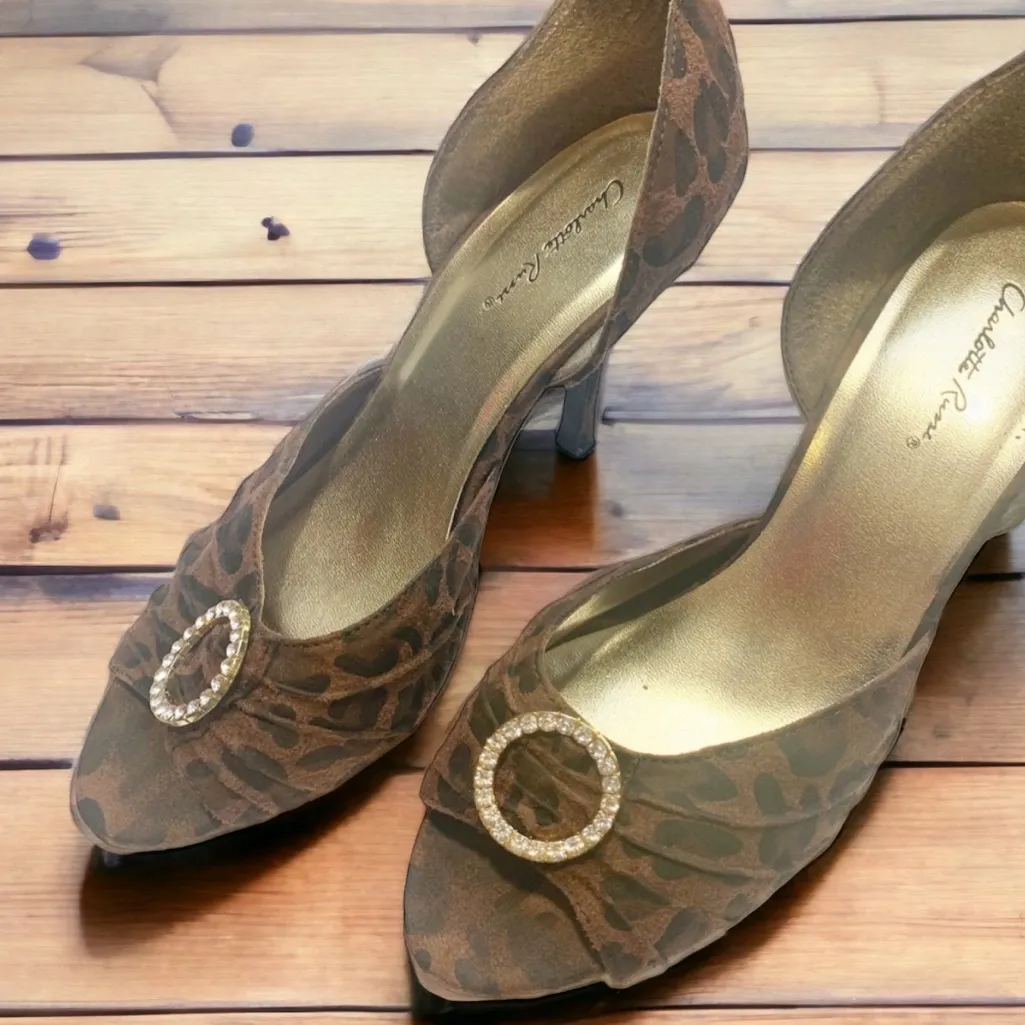 Charlotte Russe Leopard Peep Toe Jeweled Pumps Size 9 4” Heel Pre Owned Condition No Major Signs... Show more