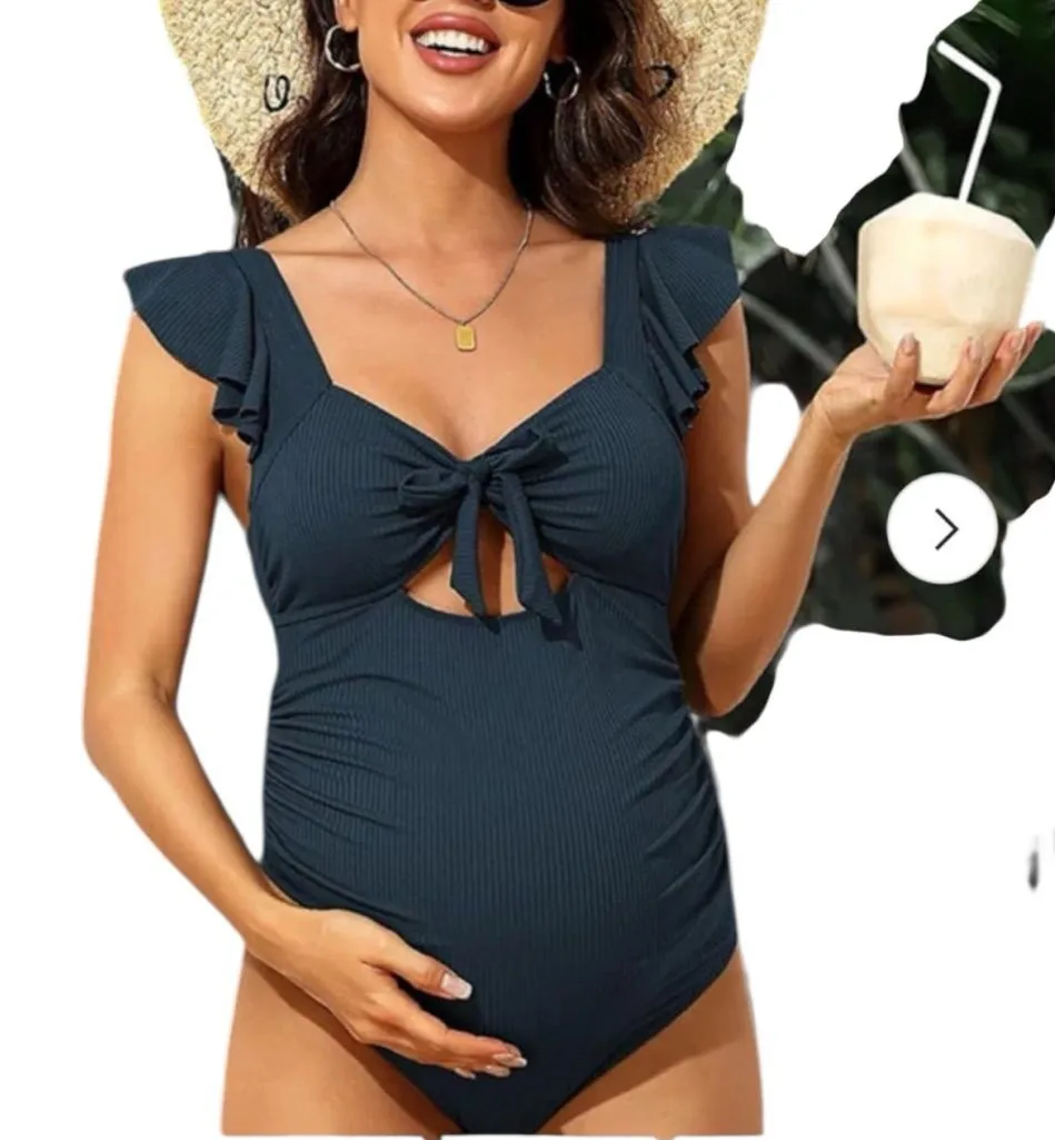 Brand new with tags. Still selling full price online. Dive into style with this elegant navy blue maternity one piece swimsuit. Featuring chic ruffle details, it's perfect for a sophisticated beach look. Adjustable straps, cut out on front, ribbed, tie in back, Rouching, UPF50+. Comes from smoke free home. Always mailed by next business day.