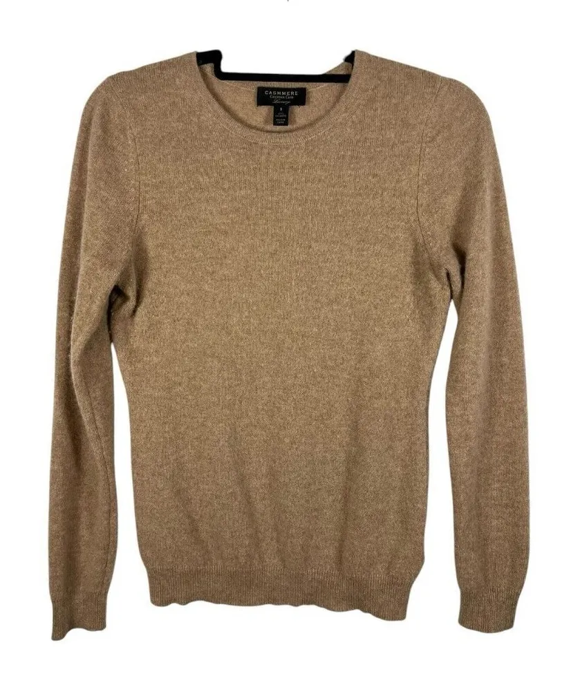 This Charter Club sweater is a luxurious and classic piece crafted from 100% cashmere in a neutral tan color. It features a crew neckline and long sleeves, making it suitable for casual outings, workwear, or business settings. The pullover style has a collarless design with a tight-knit fabric for warmth during the winter, fall, and spring seasons. The tight-knit construction and stretch material ensure a comfortable fit for a size small in women's sizing. This cozy and elegant sweater is perfect for adding a touch of luxury to your wardrobe.