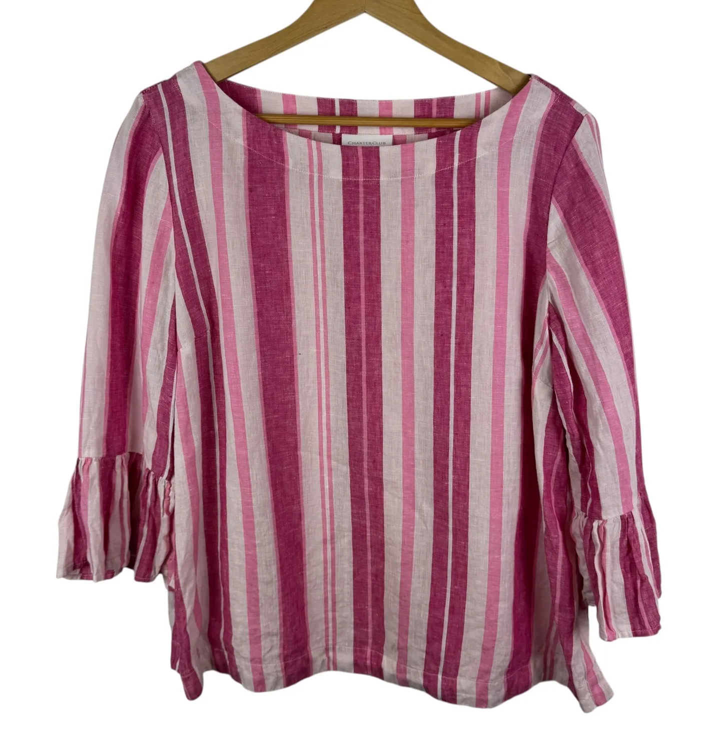 Stylish striped linen top, featuring a mix of pink and white vertical stripes. It has a comfortable boat neck and three-quarter sleeves accented with charming ruffle cuffs. The straight hem offers a relaxed fit. This top will be a great addition to your wardrobe for everyday casual wear or a relaxed weekend brunch. Type: Blouse Department: Women Style: Basic Material: Linen, 100% Linen Neckline: Boat Neck Sleeve Length: 3/4 Sleeve Sleeve Type: Flared Sleeve Accents: Ruffle Pattern: Striped Features: Collarless Fit: Relaxed Keywords: Charter Club, Linen Top, Striped Top, Pink and White Top, 3/4 Sleeve Top, Ruffle Cuff, Boat Neck, Casual Top, Women's Top, Size L, Spring Top, Summer Top, Bohemian Top, Charter Club, Linen Blouse, Pink Top, Ruffle Sleeve, Summer Shirt, Resort Wear, Lightweight, Striped Shirt, Beach Style, Boho Vibes, Vacation Top, Trending, Womens Clothing, Casual Chic Excellent Pre-Owned Condition (see pics for details) Flaws: No visible flaws. Measurements: included in photos. Please compare the measurements to something you already own for a great fit! Fast shipping: Shipped out next business day! Please let us know if you have any questions!