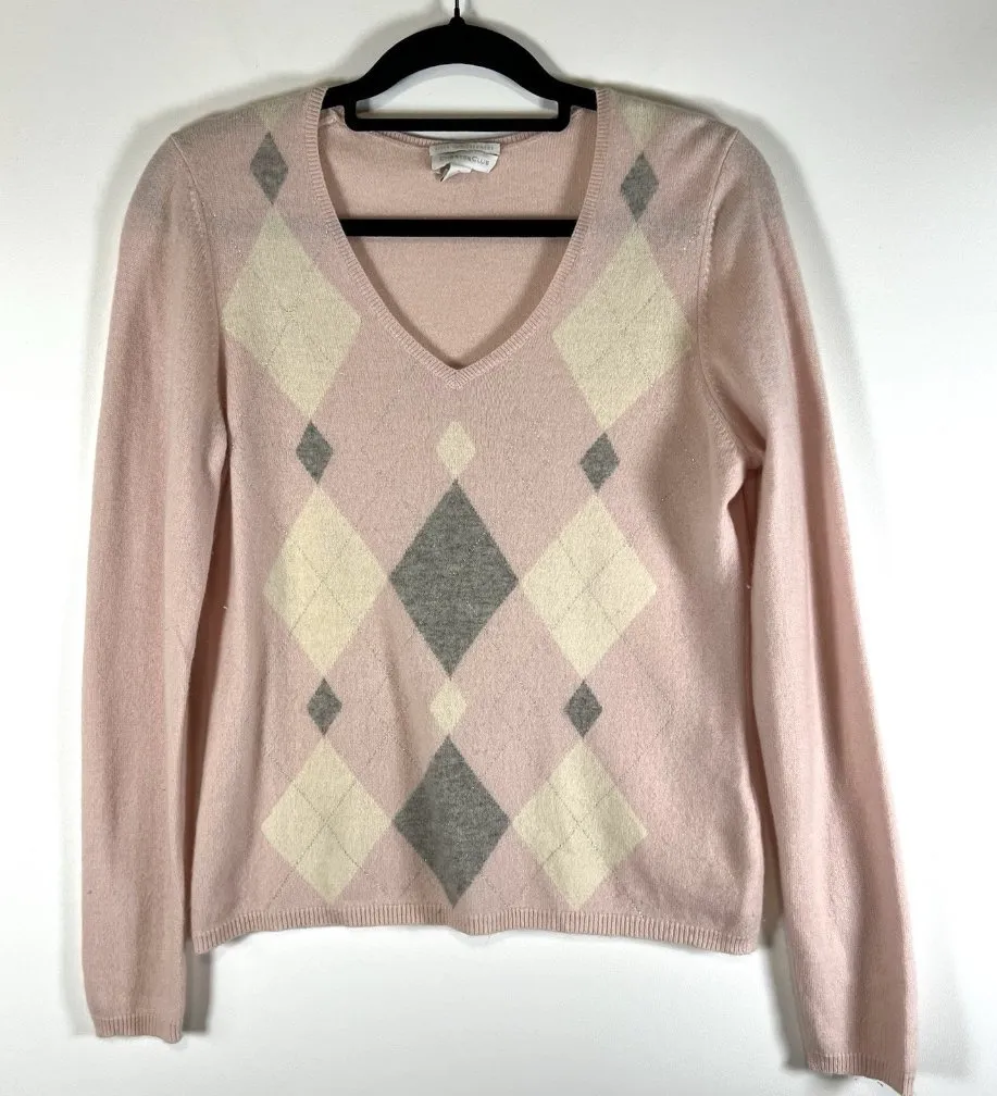 This Charter Club 100% Cashmere Sweater in a classic fit features a stylish argyle/diamond pattern with a cozy V-neck design, making it perfect for casual, workwear, or business occasions in the winter and fall seasons. The tight-knit fabric and lightweight stretch offer a comfortable and versatile option for everyday wear. The sweater is in a luxurious gray with a subtle pink accent, adding a touch of elegance to any outfit. Made by Charter Club, this pullover sweater is a timeless piece that exudes a sense of twee, countryside, and academia-inspired style. Measurements: Armpit to armpit-19 inches Length-24 inches
