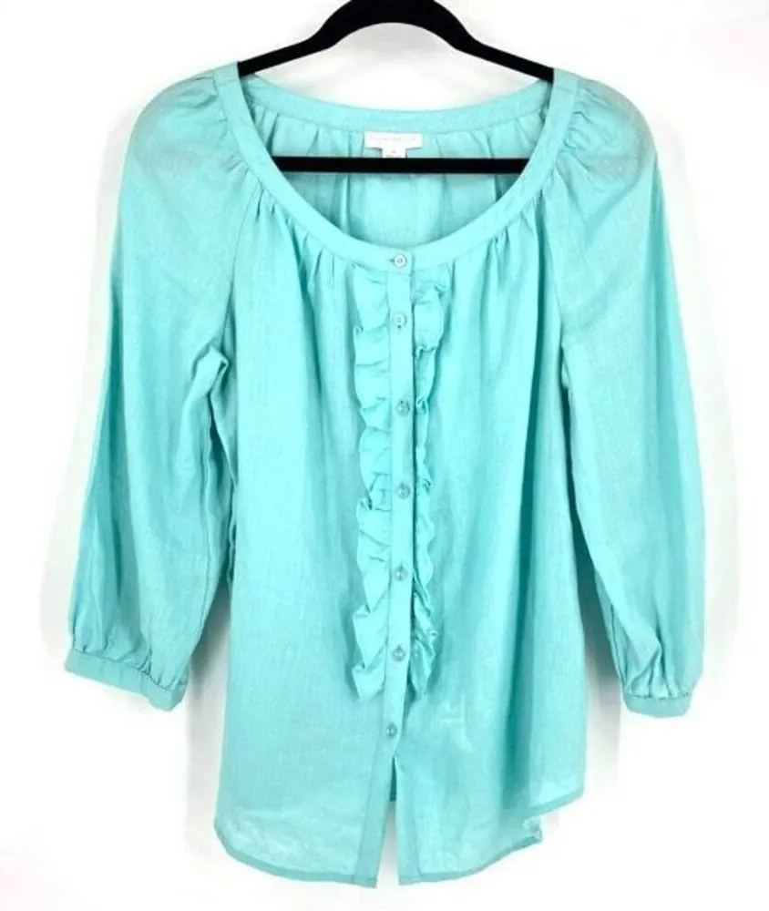 Charter Club Women's Linen Button Down 3/4 Sleeve Top Blouse Turquoise Size 6 Brand: Charter Club Department: Womens Size: 6 Color: Turquoise Type: Blouse Style: Basic Closure: Button Material: 100% Linen Pattern: Solid Condition: Excellent condition Features: - Ruffle details - Lightweight - Raglan sleeve - Boat neck - Machine washable Approximate Measurements Pit to Pit: 19.4" Length: 26" Casual, Career, Workwear, Business, Classic Smoke-free home