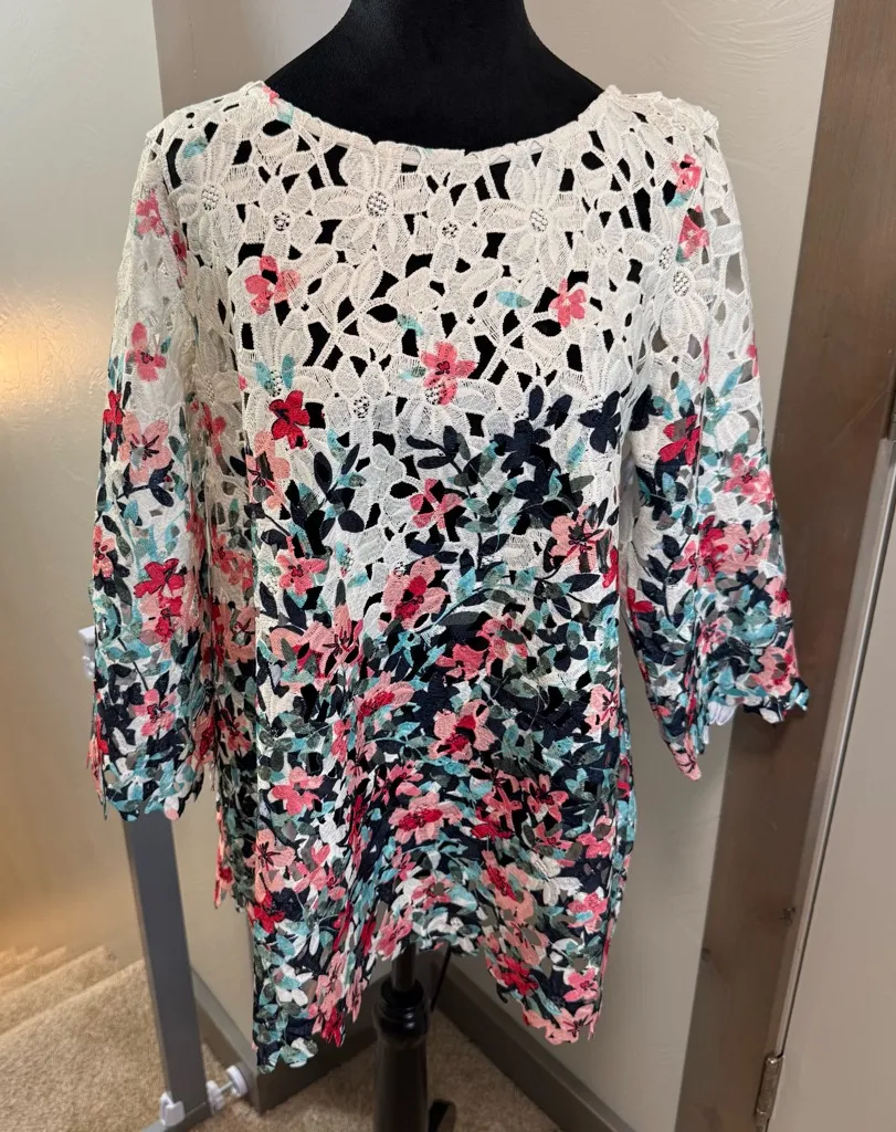 Charter Club Lace Floral 3/4 Length Sleeve Blouse White‎ Pink Blue Eyelet Spring Size M - $23 - From Abbey
