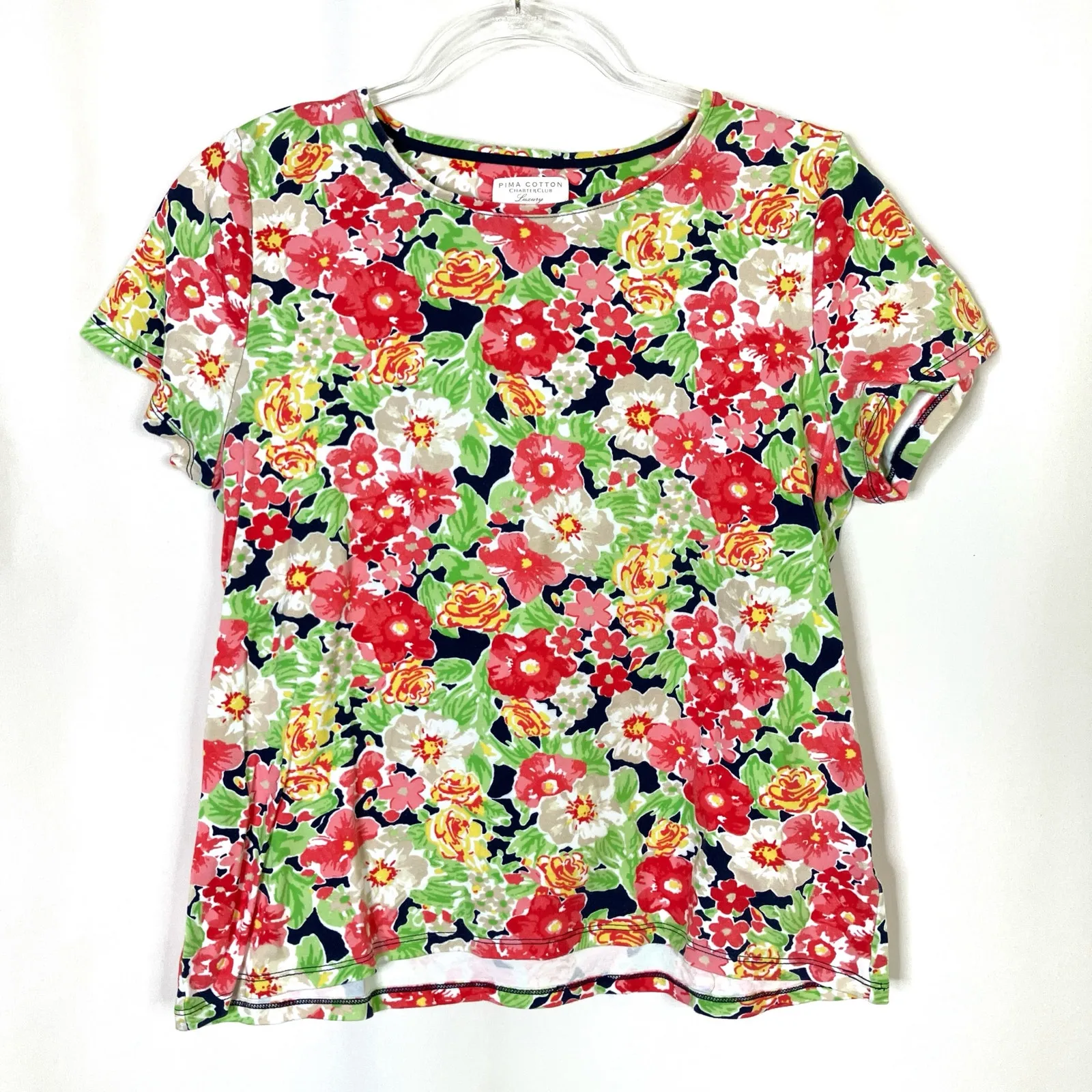 Charter Club Luxury Pima Cotton Short sleeve tee shirt Rounded neckline Pink, green, yellow floral pattern Size L 100% Pima Cotton Approximate Measurements: Chest: 19” across Length: 22.75” 5007