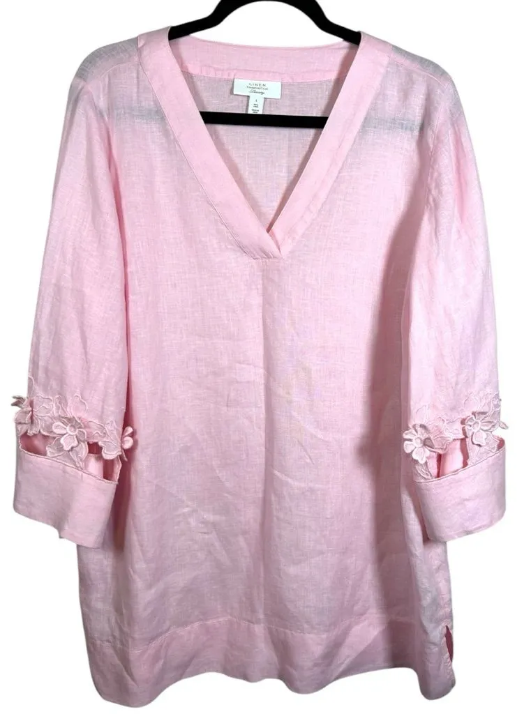Charter Club Luxury Bubblegum Pink Embroidered Floral Appliqué Cutout Linen Top Size large Excellen... Show more