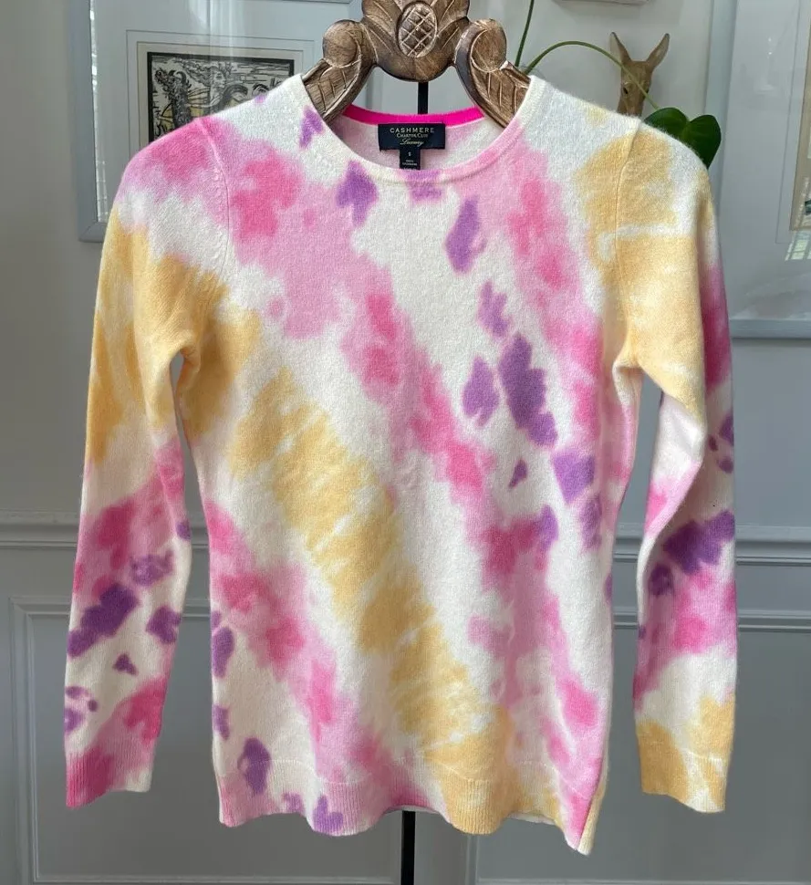 Charter club 100% luxury, cashmere crewneck sweater with tie-dye pattern and bubblegum pink, purple, sunny, yellow on ivory. Mid to lightweight. Tag size small. Measurements are approximate and taken while laying flat: 24 inches shoulder to hem and 17.5 inches armpit to armpit. No stains or holes.