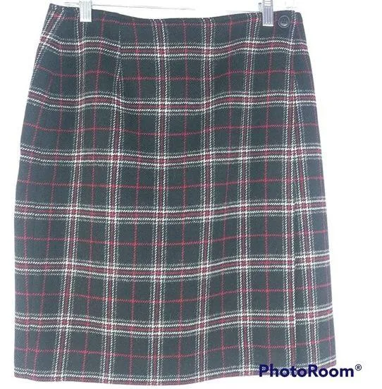 VTG Wool Chelsea Campbell By Charter Club Black Red Plaid Wrap Skirt Size 10 wrap skirt 2 button closure fully lined wool nylon blend black with white red plaid gently worn lease see photos for more details approximate measurements waist across 15" length 20"