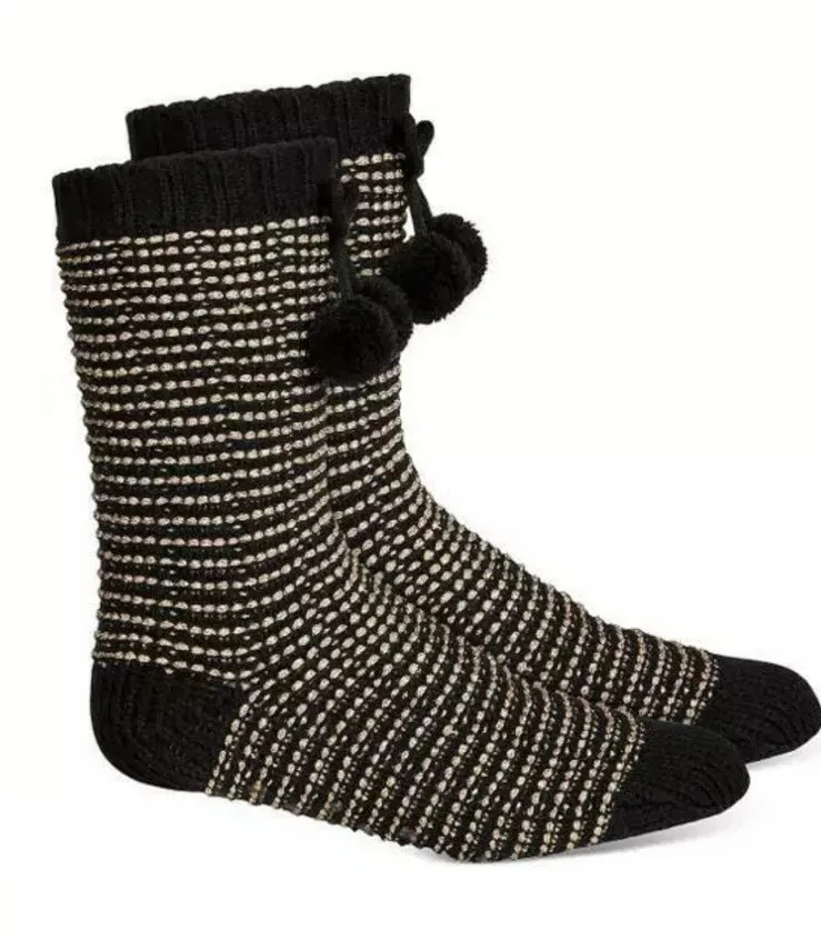 Charter Club Women's Striped Slipper Socks With Faux Sherpa Lining in Black/Pink Metallic stripes, playful poms, and super-soft faux sherpa lining combine on these ultra-cozy slipper socks from Charter Club. Size S/M: Fits shoe sizes 4-9 Special Features: Pom-pom detail Texture: Knit with faux-sherpa lining Pack Includes: 1 pair Polyester/acrylic; faux fur: polyester Machine washable New with tags. Check out the other items listed in my store/ closet follow me or make me a favorite I love to bundle to save you money on shipping and more Smoke free home
